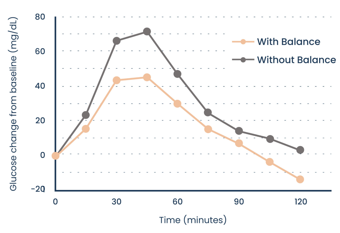 This study was conducted to measure changes in glucose response to a typical breakfast meal with and without pre-meal Balance in generally healthy adults. Continuous glucose monitor readings showed a lower peak glucose spike and lower overall two-hour post-meal glucose response when Balance was consumed 15 minutes before eating compared to the Control condition (no Balance).