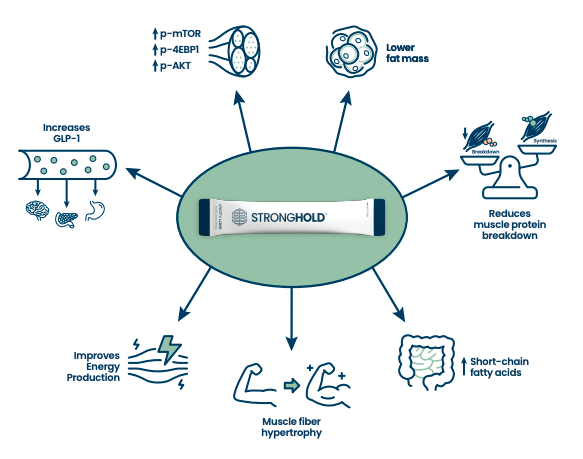 This study evaluated the effects of Stronghold by measuring anabolic signaling, GLP-1, fat mass, muscle mass, and other metrics of metabolic function. Stronghold robustly promoted muscle growth, reduced muscle breakdown, enhanced energy production, and elevated GLP-1 levels without any negative impacts on glucose or insulin homeostasis. Stronghold poses a promising and accessible nutritional intervention to counteract anabolic resistance, protect lean mass, and support metabolic health, especially as part of healthy aging or structured weight-loss programs.